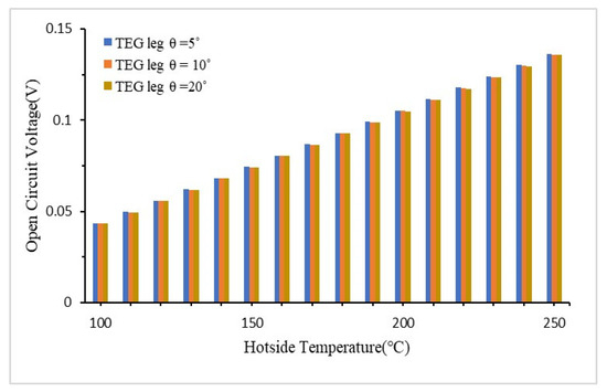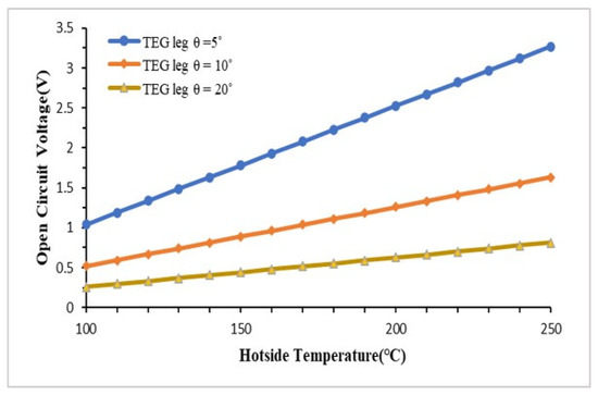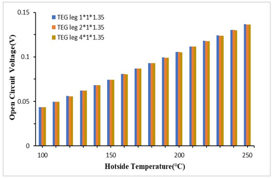 Open-circuit voltage values for FTEG with different thermoelectric element dimensions at varying hot-end temperatures [30].