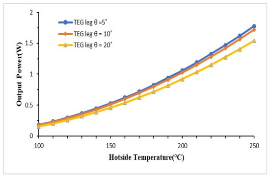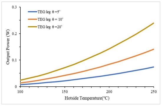Maximum output power values for ATEG with different angles between thermoelectric elements at varying hot-end temperatures [30].