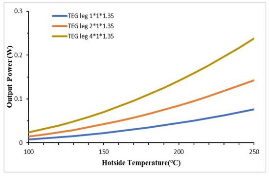 Output power values for FTEG with different thermoelectric element dimensions at varying hot-end temperatures [30].
