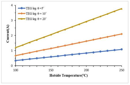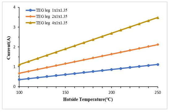 Current values for FTEG with different thermoelectric element dimensions at varying hot-end temperatures [30].