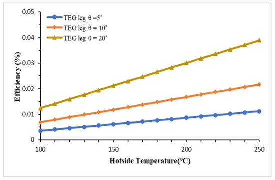 Thermal efficiency values for ATEG with different angles between thermoelectric elements at varying hot-end temperatures [30].