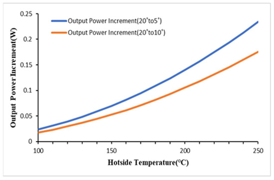 By utilizing the ATEG with a 20° angle per annular thermoelectric element as a reference point, an examination of Figure 15 demonstrates that the output power values of the three sets of thermoelectric modules, with element angles of 20°, 10°, and 5°, increase proportionally as the hot-end temperature rises. This ratio remains consistent. The module with a 5° angle exhibits a fixed proportion increase in output power compared to the 20° angle, amounting to 15.19%. Likewise, the rise in the module with a 10° angle relative to the 20° module is also a constant number, maintaining a ratio of 11.41%. The observed increase in the output power of the thermoelectric modules is due to the alteration in the number of thermocouples included in the ATEG.