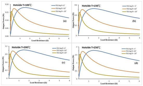 Relationship between ATEG output power and load: (a) hot-side temperature of 100 °C; (b) hot-side temperature of 150 °C; (c) hot-side temperature of 200 °C; and (d) hot-side temperature of 250 °C [30].