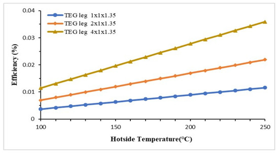 Thermal efficiency values for FTEG with different thermoelectric element dimensions at varying hot-end temperatures [30].