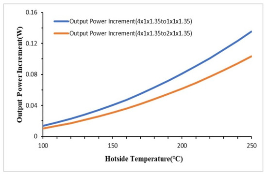 Figure 21 depicts a comparative graph that illustrates the size of the thermoelectric element, which measures 4 × 1 × 1.35 mm. The graph illustrates that the output power of the three sets of thermoelectric modules, with element sizes of 4 × 1 × 1.35 mm, 2 × 1 × 1.35 mm, and 1 × 1 × 1.35 mm, grows proportionally as the hot-end temperature rises. Furthermore, the rate of increase remains constant. The module with a 1 × 1 × 1.35 mm element size has an output power of 28.53% greater than that with a 4 × 1 × 1.35 mm element size. Similarly, the module with a 2 × 1 × 1.35 mm element size has an output power of 21.77% higher than the 4 × 1 × 1.35 mm module. The main reason for the rise in output power is the alteration in the quantity of thermocouples included in the FTEG. Hence, the quantity of thermoelectric components is a determining factor that influences the power generated in ATEG and has a comparable effect on FTEG.