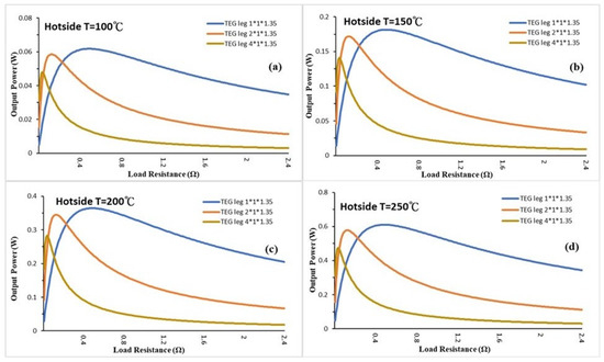 Output power values for FTEG at different hot-end temperatures and varying load resistance: (a) hot-side temperature of 100 °C; (b) hot-side temperature of 150 °C; (c) hot-side temperature of 200 °C; and (d) hot-side temperature of 250 °C [30].