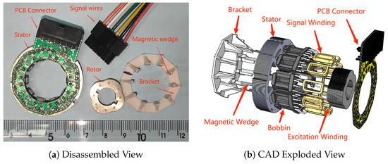 The SSPWMW-VRR is designed to minimize harmonic distortion and improve signal integrity through a specialized winding configuration. As shown in Figure 1, the prototype consists of key components including the stator, a printed circuit board (PCB) connection board, a salient pole rotor, and a magnetic slot wedge with its supporting structure.