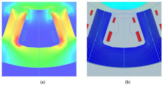 Figure 4. Magnetic field distribution in SSPWMW-VRR. (a) Magnetic flux density distribution in the stator slots. (b) Magnetic field line distribution in the stator slots. - Middle Layer (Data Processing and Feature Extraction): This layer utilizes MATLAB to convert the electrical signals obtained from FEA into the angle error signals that are crucial for resolver-to-digital conversion. The data processing includes extracting relevant electromagnetic features like flux density and slot leakage flux and transforming them into a format suitable for machine learning models using Python scripts. This stage ensures that the data are prepared for training and validation in the machine learning stage. The use of both Windows and Ubuntu operating systems in this process reflects the flexibility of our approach, allowing for the use of different software tools across platforms.