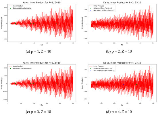 By varying the winding distribution coefficient within a range of 20–500 using PSO, the algorithm seeks values that minimize the inner product of the sine and cosine windings and ensure the balance of positive and negative turns. As the winding configurations are discrete, only specific values satisfy both these conditions. Figure 6 illustrates the distribution of values for multiple pole–pair configurations in a 10-slot stator, highlighting the instances wherein the inner product is zero and the sum of positive and negative turns is balanced, thus achieving orthogonality and symmetry.