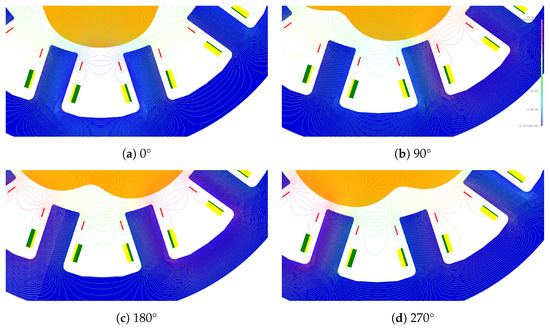Figure 7 shows the air gap magnetic field distribution when the rotor salient pole’s centerline corresponds to the slot centerline at 0°, 90°, 180°, and 270° positions, allowing for a detailed observation of how the slot leakage flux fluctuates with the rotation of the salient pole rotor. To accurately analyze this phenomenon, an equivalent magnetic circuit model based on the variations in the slot leakage flux was established. As shown in Figure 2, this study introduces , and within the slot to comprehensively describe the influence of the slot leakage flux on the output signal. Unlike conventional motor slot leakage inductance, the asymmetrical positions of and at opposite sides of the slot opening are due to the salient pole effect. Assuming a minimal influence of the salient pole on the slot leakage flux, it can be approximated that is equivalent and can also be treated as approximately similar. To simplify the analysis, a star-to-delta transformation is applied to certain sections of some components. Figure 8 shows the resultant simplified equivalent magnetic circuit. Observation reveals that the induced voltage on the secondary winding considering , , and linked with turns can be expressed as follows:
