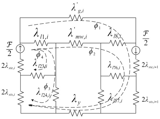 To accurately analyze the impact of slot leakage flux on the resolver’s performance, the MEC method is employed. MEC provides a detailed representation of the magnetic flux distribution, allowing for precise simulation of magnetic behavior within the stator slots. The key factor contributing to accuracy degradation in the resolver is the periodic fluctuation of slot leakage inductance as the rotor rotates, which distorts the magnetic field and negatively affects signal accuracy.