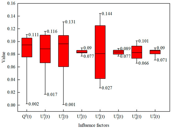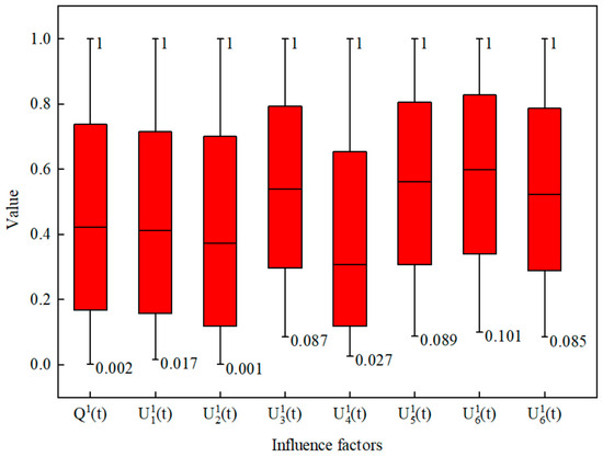 The F-values in descending order are U2(t), U3(t), U7(t), U6(t), Q(t), U4(t), U1(t), and U5(t), indicating that the influence of the reserve abundance, number of wells in operation, controlled reserves, previous year’s gas production, formation pressure, energy storage coefficient, effective thickness of matrix, and annual production time on the annual gas production gradually increases.