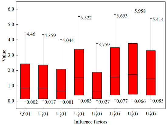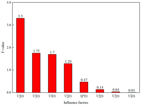 The F-values for Q(t) (gas production), U1(t) (number of wells in operation), U2(t) (production time), U3(t) (effective thickness of reservoir), U4(t) (controlled reserves), U5(t) (reserve abundance), U6(t) (formation pressure), and U7(t) (energy storage factor) are graphically represented in Figure 8. A clear trend is evident, with the F-values arranged in descending order as follows: U2(t), U3(t), U7(t), U6(t), Q(t), U4(t), U1(t), and U5(t). This ranking underscores the increasing influence of the annual production time, effective thickness of the reservoir, energy storage factor, formation pressure, gas production, controlled reserves, number of wells in operation, and reserve abundance on the annual gas production. The visualization of these F-values provides a quantitative assessment of the relative significance of each factor in the predictive model [31].