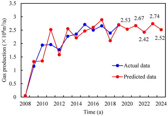 Utilizing the gas production and predicted data from 2009 to 2019, the coefficient of determination was calculated to be 0.99, as per Equations (11)–(14). This high value for the coefficient of determination signifies that the gas production data are closely aligned with the predictions of the fitting model, thereby confirming the model’s efficacy in capturing the production trends over the specified period.