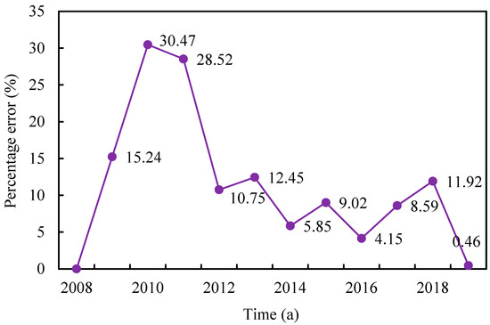 The gas production data and predicted values for the years 2008 to 2019, along with the projected production for 2020 to 2024, are graphically represented in Figure 6. A clear observation is that the predicted production aligns closely with the actual production across different years, indicating that the gas field reached a stable production phase by 2019. Additionally, Figure 7 illustrates the discrepancies between the actual and predicted gas production. The prediction error ranges from 0.46% to 30.47%, with an average error of 12.49%. It is evident that the error tends to diminish progressively with the extension of the mining period and the accumulation of production data, suggesting an improvement in the predictive accuracy over time.