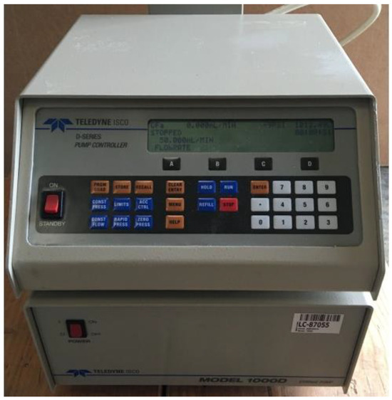 Advanced core displacement and high-precision CT scanning equipment were used in this study. A non-destructive 3D X-ray microfocus computed tomography system, along with a high-pressure, high-precision plunger pump and customized core holding, were utilized. This was used with the Xradia MicroXCT-400 micro-CT (Xradia, Inc., Pleasanton, CA, USA), which has a maximum resolution of <1 μm. This gives full interior details of large samples in a 3D panorama as it enables high-resolution and high-contrast imaging for small samples while using large geometric magnifications. Since 4 mm is required for the core displacement analysis, a special gripper was developed. During the process, a small core plug of 4 mm in diameter and about 8 mm long was produced using wire-cutting technology. The core was put into the core gripper for oil-water displacement analysis (Figure 1). Teledyne ISCO high-pressure high-precision piston pump 500D (Teledyne ISCO, Lincoln, NE, USA) was employed for flow control. This is to allow the solvent in the pump to attain 507 mL and a desired pressure of 10–3750 psi. Experimental flow rates vary from single (0.001–204 mL/min) to double pump continuous flow (0.001–133 mL/min) at a set accuracy of 0.5%, drive resolution 31.71 nL (Figure 2).