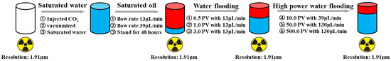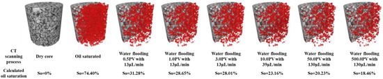 - Li, J.; Jiang, H.; Wang, C.; Zhao, Y.; Gao, Y.; Pei, Y.; Wang, C.; Dong, H. Pore-scale investigation of microscopic remaining oil variation characteristics in water-wet sandstone using CT scanning. J. Nat. Gas Sci. Eng. 2017, 48, 36–45. [Google Scholar] [CrossRef]
