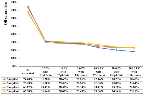 Generally, the experimental results reveal the characteristics of different production stages, and the guiding rule is that the displacement speed increases from 13 μL/min to 39 μL/min. An increase in the pore volume from 3 PV to 10 PV brings a great improvement in the degree of recovery. It has to be noted that, although displacement efficiency continues to rise from 10–50 PV, change in the degree of recovery slows down after 50 PV.
