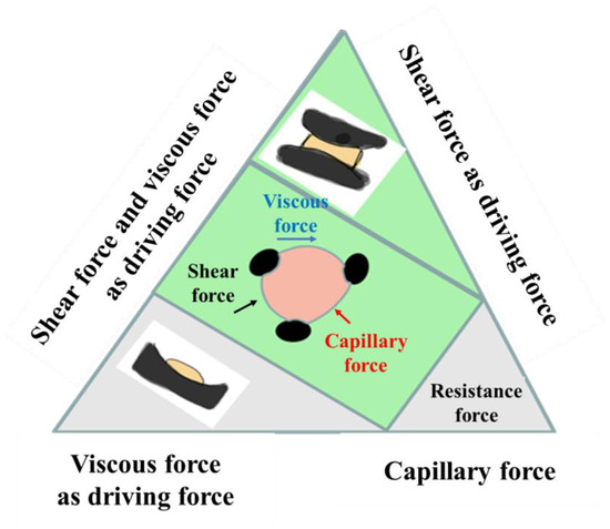 To clearly define the remaining oil, this study explores and analyzes all the possible forces based on a dynamic balance perspective. In principle, each microscopic force may be the driving force of the microscopic remaining oil but also constrain the movement of the oil to a certain extent. Therefore, to have a clear picture of the combined triangular force distribution in Figure 6, each micro-force form was analyzed and the result is shown in Table 4.