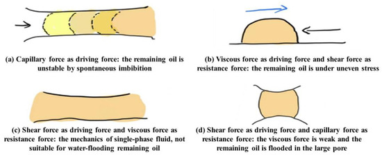 Based on the dynamic equilibrium analysis of each of the forces, it can be observed that if the capillary force is the driving force, its microscopic force state is imbibition as shown in Figure 7a. This is a case where the water phase is constantly driven by the capillary force to transport the oil phase, which makes it difficult to form a stable remaining oil distribution. When the viscous force is the driving force with positive pressure as the resistance, the conceptual force model is shown in Figure 7b. Under the combined action of viscous shear and positive pressure, the oil phase is distorted until part of the oil phase is removed. This leads to weakening of the positive pressure and the microscopic remaining oil develops capillary force as the resistance. Therefore, the microscopic force distribution will result in force imbalance. The microscopic force with positive pressure as the driving force and viscous force as the resistance occurs mainly in the process of internal flow of single-phase fluid (Figure 7c). Positive pressure drives fluid movement, resulting in viscous dissipation and pressure loss within the fluid. This does not apply to the force analysis of microscopic remaining oil. Furthermore, having positive pressure as the driving force and capillary force as the resistance indicates that, the viscosity of the microscopic remaining oil is extremely weak with no viscous shear between the two phases of fluid. This force type is typical of the water-oil displacement process in large channels (Figure 7d). In this case, the oil phase moves continuously under positive pressure until it breaks away from the constraint of the pore structure. Therefore, this force does not apply to the microscopic remaining oil in the digital core with pore structure as obtainable in this work.