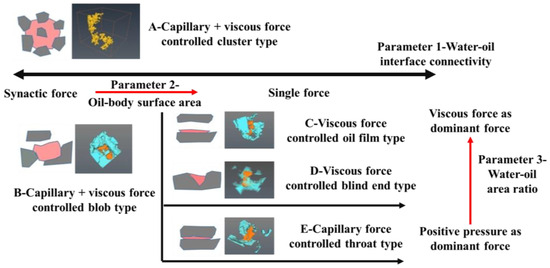 Based on the water-oil interface connectivity, the pore structure can be divided into high connectivity and low connectivity. The high connectivity type belongs to the porous type with capillary + viscous force-controlled cluster type, which is mainly characterized by multi-force. As for the low connectivity type, it is generally a single oil droplet. The remaining oil of low connectivity single oil droplets can be further subdivided into high and low specific surfaces according to the oil-body surface area. Meaning that the lower the specific surface, the more spherical it tends to be. This is mainly controlled by capillary + viscous forces and is defined as the oil droplet controlled by capillary and viscous forces. The higher the specific surface, the more flat or cylindrical it tends to be. The remaining oil with a low water-oil area ratio is mainly dominated by capillary force and is defined as a cylindrical shape controlled by capillary force. In contrast, the remaining oil having a high water-oil area ratio is flat or irregular with a blind end shape dominated by viscous force. This is often defined as the blind end and oil film type controlled by viscous forces.