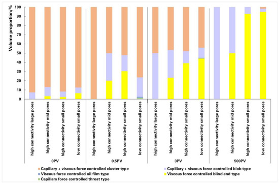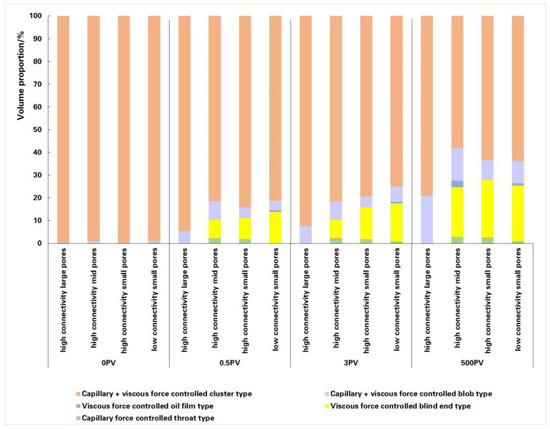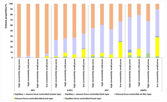 Pore structure characteristics are one of the main factors controlling the distribution of microscopic remaining oil [38]. To define the dynamic distribution characteristics of remaining oil in different reservoirs, it is necessary to first classify the microscopic pore structure. As earlier mentioned, based on the fluid dynamic behavior in the pore structure, the pore flow capacity and connectivity are the main evaluation indexes. On this basis, the microscopic pore structure is divided into high-connectivity large pores, high-connectivity mid pores, high-connectivity small pores, low-connectivity large pores, low-connectivity mid pores and low-connectivity small pores. Knowing this, the distribution characteristics of the remaining oil types in different reservoirs’ pore structures were extracted.