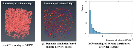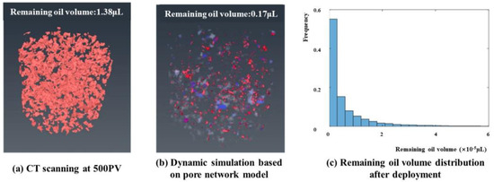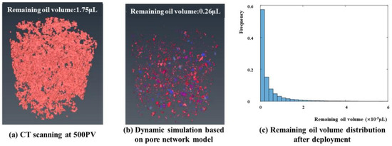Class-III reservoir. Based on the displacement experiment of Sample-4 from the Class-III reservoir, the dominant type of microscopic remaining oil in the class-II reservoir is E-type. The microscopic force is driven by positive pressure and resisted by capillary force. Morphologically, it is characterized by low water-oil interface connectivity, small water-oil area ratio and large oil-body surface ratio. For this class, it can be inferred that the positive pressure can be increased via high driving force, while the capillary force can be weakened by reducing the surface tension. This is necessary to break the dynamic equilibrium of the microscopic remaining oil and promote the production of the E-type oil. The effectiveness of these measures can be verified by reducing the surface tension of the fluid to 1 mN/m during the simulation. Figure 16b shows the microscopic remaining oil morphology after dynamic simulation. A close look reveals that, after the two-phase distribution of water and oil gets to a stable state, the overall microscopic remaining oil has reduced to 0.52 μL. When compared with the remaining oil volume before deployment (1.19 μL), the displacement efficiency after the deployment has increased by 17.5%. Moreover, the volume of the microscopic remaining oil in the digital core after production is about 0.9 × 10−5 μL in Figure 16b, with an average equivalent diameter of 20 μm, meaning that the volume of the microscopic remaining oil in the digital core was greatly reduced.