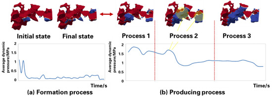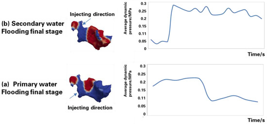 The main effect of increasing liquid is to change the dynamic pressure in the pore space during this process of utilization. In the late stage of the first water flooding, the stability of the dynamic pressure (at about 0.06 MPa), does not allow the formation of an effective driving pressure difference. The water driving force was enhanced by increasing the injection flow rate to increase the dynamic pressure from 0.18 MPa to 0.35 MPa during the secondary water flooding. This pushed the oil–water phase interface to move and cut off the original porous remaining oil, hence, part of the A-type remaining oil was made to migrate (Figure 17).