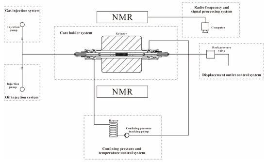 The synchronous core displacement NMR system comprises an oil injection system, a gas injection system, a confining pressure and temperature control system, a core holder system, a radio frequency and signal processing system, and a displacement outlet control system. The oil and gas injection systems provide displacement pressure to the samples, capable of reaching up to 70 MPa. A specialized non-magnetic core holder is employed within the core holder system, where the internal fluorine oil pressure is precisely regulated by the confining pressure and temperature control system. The radio frequency and signal processing system is responsible for signal collection and data processing. The displacement outlet control system applies outlet-end displacement pressure to the sample, effectively simulating reservoir displacement conditions. A schematic of the experimental setup is shown in Figure 3.