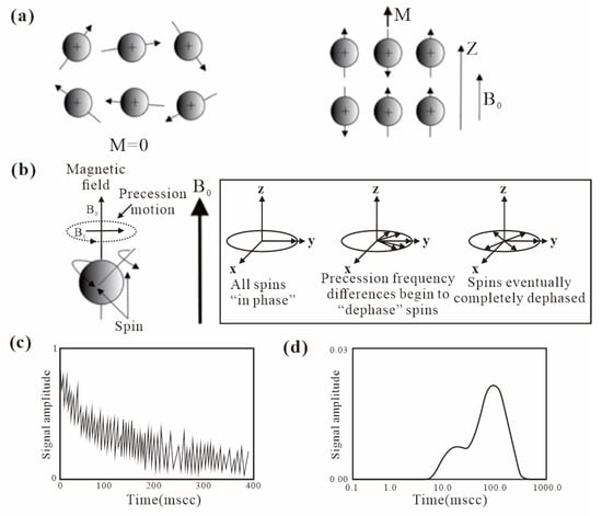 Nuclear Magnetic Resonance (NMR) technology fundamentally involves the acquisition and processing of proton-based information, as depicted in Figure 4 [20]. Prior to NMR analysis, protons in the sample’s fluid are typically randomly oriented. At the onset of testing, a constant magnetic field is applied, aligning the protons along the direction of the magnetization vector. This is followed by an alternating electromagnetic field, inducing proton precession. Upon removal of all magnetic fields, the protons gradually return to their equilibrium state—a process termed relaxation. During relaxation, a CPMG (Carr–Purcell–Meiboom–Gill) sequence is employed to generate a series of spin echoes, collectively forming the raw NMR data (see Figure 4c). Through fitting these raw data, a T2 relaxation time distribution curve is obtained, providing critical physical parameters for fluid property analysis.