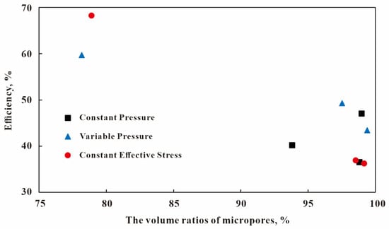 Micropore volume ratios and CO2 displacement efficiency across various displacement conditions.