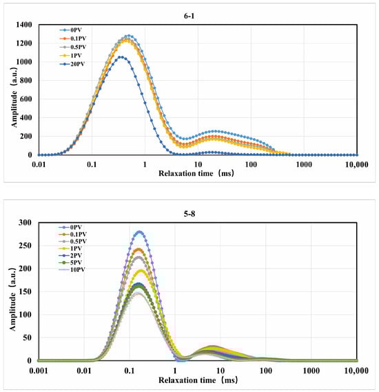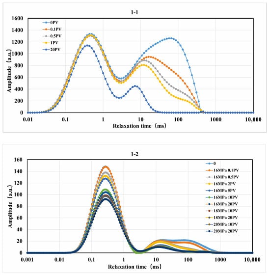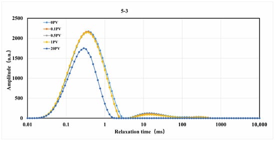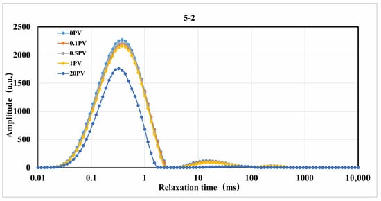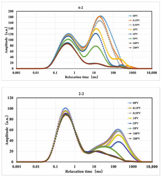 When CO2 displaces oil in the core, the T2 spectrum is used to dynamically monitor changes in oil flow and the distribution of residual oil. Based on previous studies [24,31], the horizontal coordinate intervals in the T2 spectrum are defined as follows: <1 ms is defined as the micropore region, 1–10 ms as the small pore region, 10–100 ms as the medium pore region, and 100–1000 ms as the large pore region. Additionally, since the oil in the fracture experiences less force from the solid surface of the core compared to the oil in the matrix, the relaxation time of oil in the fractures is longer. Moreover, the displacement process of CO2 in fractured cores is more complex. Therefore, more T2 spectrum measurements were taken in the fractured cores to observe the microscopic changes within them.