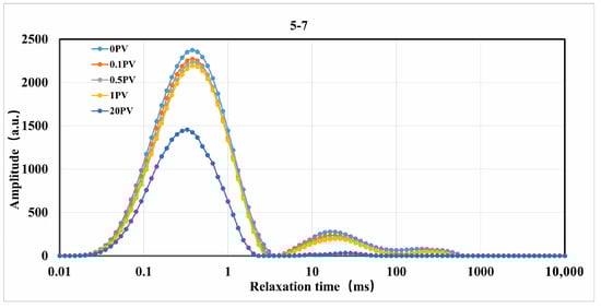 As shown in Figure 7, Figure 8 and Figure 9, the T2 spectra of the cores in the residual oil state under constant pressure, variable pressure, and constant effective stress conditions exhibit significant fluctuations with the increase in injection volume. Compared to the initial state, the amplitude of the T2 spectrum gradually decreases with the increase in CO2 injection volume, and the T2 spectrum in the micropore region of all cores decreases significantly, indicating that oil is displaced to varying degrees from the cores [32]. Under constant injection pressure conditions, the micropore region contributes significantly to the recovery rate; under variable injection pressure and constant effective stress conditions, the medium pore region also contributes significantly to the recovery rate [33].