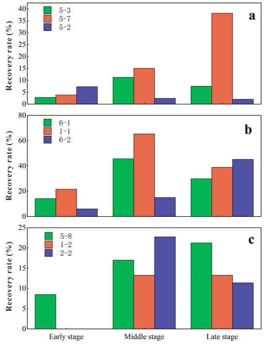 CO2 oil displacement recovery stages: (a) low-permeability samples; (b) medium-permeability samples; (c) high-permeability samples.
