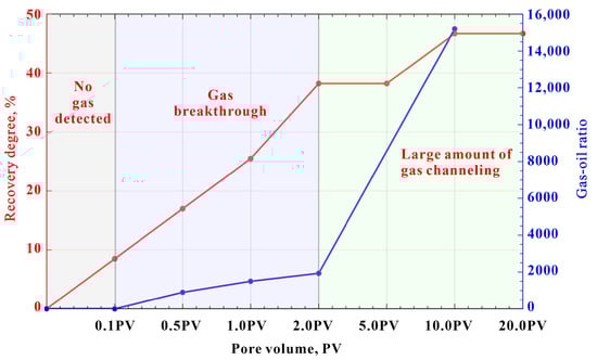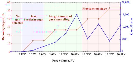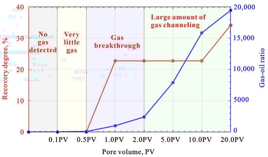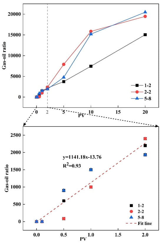 The displacement process of fractured rock samples was closely monitored. Based on the gas–oil ratio and recovery degree at the outlet section of the fractured rock samples, the CO2 oil displacement exhibited “no gas detected” and “gas detected” stages. Depending on the injection conditions, the “gas detected” stage can include various sub-stages, such as “very little gas, gas breakthrough, large gas channeling, gas fluctuation” (Figure 14, Figure 15 and Figure 16). Specifically, during the “no gas detected” stage, the gas–oil ratio is zero, and the recovery degree is zero under both variable injection pressure and constant effective stress conditions. In the range of 0.1–0.5 PV under constant effective stress conditions, the gas–oil ratio is 85, which is classified as the very little gas stage. Under constant and variable injection pressure conditions, the gas breakthrough stage begins at 0.1 PV of injection volume and ends at 2 PV. During this stage, the recovery degree ranges from 0 to 40%, and the gas–oil ratio ranges from 100 to 4000. The large gas channeling stage has a gas–oil ratio greater than 4000. Although the displacement stages vary for different cores, the gas–oil ratio is in the breakthrough stage within the range of 0–2 PV. During this stage, the gas–oil ratio of different cores shows significant variation and follows the trend of the fitted line (y = 1141.18x − 13.76, R2 = 0.93) (Figure 17).