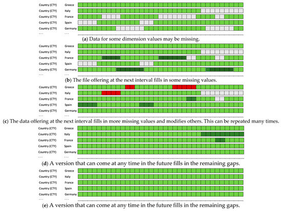 However, not all the data values are contained in every consecutive version of each csv file: there are missing values, as well as errors that are corrected in the offerings of the csv that come next. This is demonstrated in the Figure 2 below, where the progression of filling missing data over time is visually demonstrated.