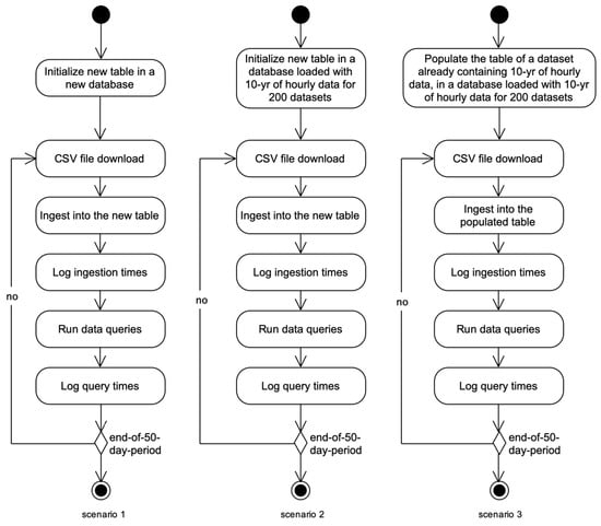 For each scenario, the daily available CSV file of “Actual Total Load”, a dataset for ENTSO-E, was ingested into the database, and the system waited for the ingestion process to complete. This was repeated using files produced over a 50-day time frame; during this period, the size of the file was incremented until the end of the month, and initialized on the following day. The corresponding absolute number of operations for 30 days is displayed in Table 1 above. The time needed for this operation was logged using tools internal to the database and Python’s perf_counter library. Once the data were ingested, the database was queried, and the time for that operation was also recorded. This process repeated in a loop until all data were ingested and queried. The flow of the overall experiment planning is shown in Figure 4.