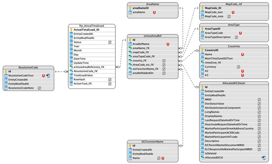 In our study, we used a MySQL database system configured to store a fully loaded database loaded with about 10 years of historical data at time resolutions from 15 min to 1 h. The primary goal was to evaluate this system’s performance under varying conditions that affect performance, such as with and without indexing on timestamp columns, to provide an understanding of MySQL’s capabilities in different operational settings that affect time-series data. The relational schema of the dataset used in our experiment is shown in Figure 5, grouping the dimensions of the dataset in one table (“entsoeAreaRef”) to improve performance.
