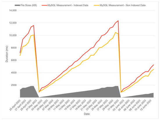 For the MySQL system to act as the control group, we used the same data load across all DBs. An anticipated finding was an observed correlation between the file size and various performance metrics. This correlation held true across different file sizes, with the exception of smaller files, which came at the beginning of each month, as shown in Figure 6. On average, processing speed improved by 14.61%, with a standard deviation of 5.23%, when the system ran with indexing. This highlights the impact time indexing has on MySQL performance.