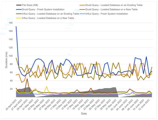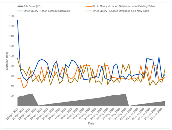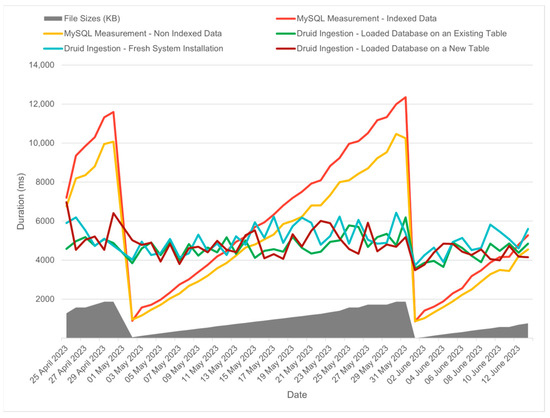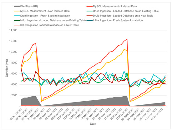 The results in Figure 8, show a correlation between file size and ingestion time, although this correlation was not particularly strong, especially when compared to what was observed with MySQL. Despite the variations in file size, we can see that the ingestion performance remained relatively consistent, even when the database was heavily loaded or when the table contained a large amount of data that fell outside the range of the new data being ingested. This stability in ingestion time can be attributed to Apache Druid′s use of timestamp-based indexing, which allows it to efficiently handle time-based data without a significant impact on performance.