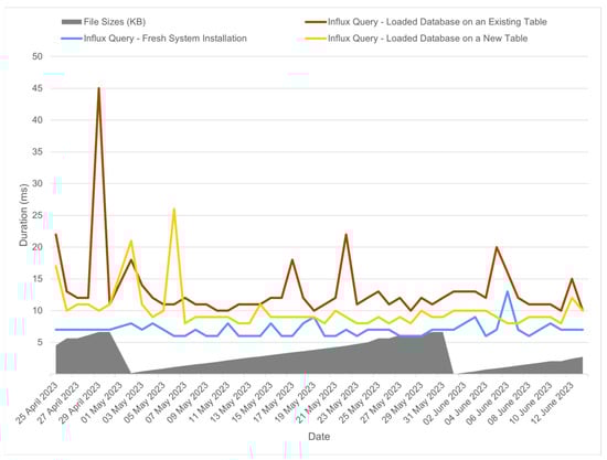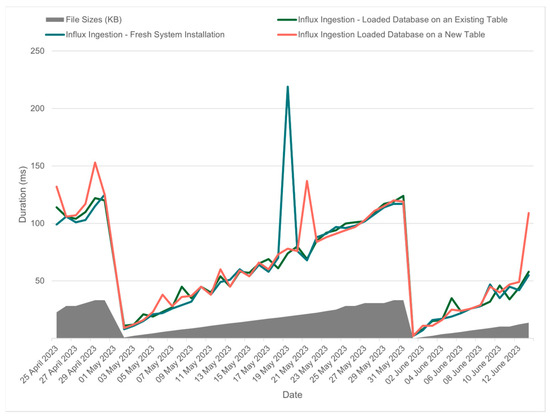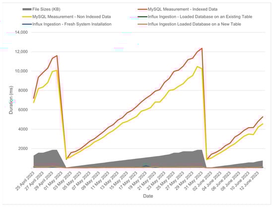 When factoring SQL into our comparison, a decrease in performance is evident. Figure 12 indicates a gap in ingestion performance between MySQL and InfluxDB. Specifically, SQL’s ingestion times peak around 12 s, while InfluxDB is one time of magnitude faster, with times peaking around 120 ms.