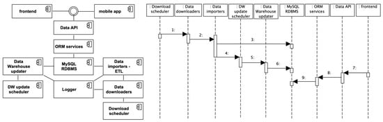 On the right side of Figure 15, a UML sequence diagram shows the operations executed in a typical cycle, from downloading source data, updating the database and the DW, and accessing data from a frontend application.