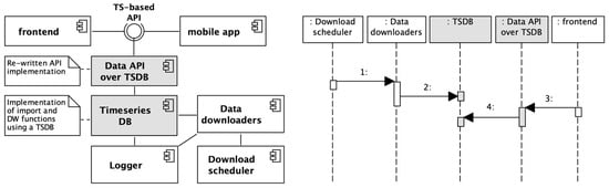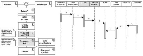 On the right side of Figure 16, a UML sequence diagram shows the operations executed in a typical cycle, from downloading source data, updating the database and the DW, and accessing data from a frontend application. Compared to Figure 15, the number of operations has now decreased to seven; most importantly, the critical operations of data ingestion are now performed by the TSDB. Ingested data must still be migrated to the RDBMS (operation no. 4 in Figure 16), so that no further changes to the upper layers are required.