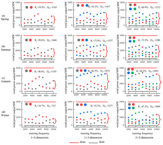 Figure 2 reveals the variation of each neuron’s median weight corresponding to training frequency for different SOM dimensions. The topology diagram of the competitive layer is shown in the upper left corner, with each neuron identified by different colors and circles. The right upper corner displays the values and values at the completion of training. As shown in Figure 2, the distribution of the median weight values after training is more dispersed than the initial values. The 1 × 3 dimension exhibits the largest value for each period, with the maximum values being 61.2%, 72.9%, 66.5%, and 52.2% for spring, summer, autumn, and winter, respectively. The SOM neurons are not uniformly distributed between maximum and minimum values but tend to be located in the intervals where sample data are more densely grouped, ensuring that neurons are trained to move closer to the sample points in their respective winning neighborhoods. The values indicate that the 1 × 2-dimensional competitive layer structure has poor representativeness for wind power output clustering and is therefore not recommended. The 2 × 2-dimensional structure still has neurons that nearly overlap each other, with unclear category boundaries, so it is not recommended either. Further identification of the appropriate number of clusters will be conducted using the competitive layer topology diagram.