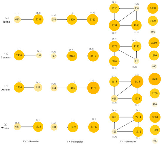 Figure 3 provides a comparison diagram of the competitive layer topology in different dimensions of the SOM. The median weight value of each neuron is represented by the size and color depth of the circles, with the specific size reference on the right side. The number inside each circle indicates the specific weight value of a neuron, and the information in square brackets represents the position of a neuron in the competitive layer structure, with arrows indicating the direction from small to large weight values. After training, the median weight values of the neurons in all seasons increase in a certain direction without inversion between neurons, indicating that the topological structure in each dimension can reflect the original topological structure of the data. The 1 × 3-dimensional structure has the highest representativeness, and the representativeness of the 2 × 2-dimensional structure is similar to that of the 1 × 3-dimensional structure. However, too many categories in wind power output clustering will blur the boundaries of each category; therefore the 1 × 3-dimensional structure was selected as the competitive layer structure for the classification of wind power output in the Hunan power grid.