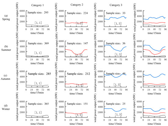 Wind power output is intermittent and volatile and exhibits both diurnal and seasonal variations [36,37]. The wind power output time series with the daily minimum window has the strongest periodicity and has obvious daily and seasonal distribution characteristics. Therefore, clustering the daily wind power output processes by season can extract wind farm scenarios that simultaneously represent both diurnal and seasonal variations.