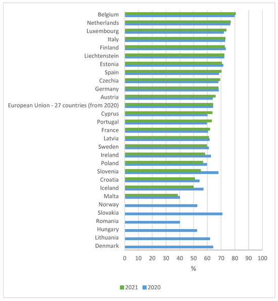 Analyzing Eurostat [19] and Central Statistical Office [21] data for individual European countries, it can be noted that the recycling level in 2020 was below 64% (i.e., the average in the EU-27) in countries such as Cyprus (60%), Portugal (60%), Ireland (62%), Sweden (61%), Greece (60%), France (60%), Poland (60%), Croatia (54%), Latvia (61%), Lithuania (62%), Hungary (52%), Iceland (57%), Norway (53%), Romania (40%), and Malta (40%). It is true that not all of the countries mentioned belong to the EU, but the table in Figure 1 shows a large difference in the percentage levels of packaging waste recycling in individual countries. The highest recycling rates in 2021 are in countries such as Belgium—80%, Netherlands—77%, Luxembourg—74%, and Italy—73%. The largest decline in the recycling rate from 2020 to 2021 was recorded in Slovenia (from 68% to 55%). In 2020 and 2021, several countries recorded an increase in recycling rates, but it was small and ranged from 1% to 3%.