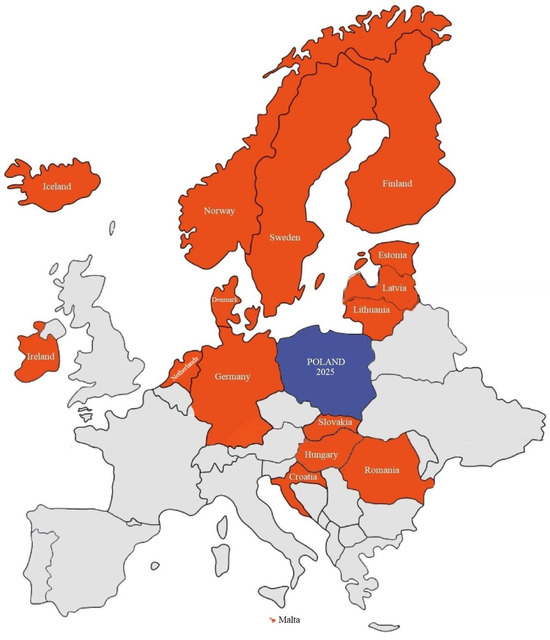 New EU plans and targets for CE [1,2] for a cleaner and more competitive Europe constitute a big challenge for many European countries, including Poland. An example is the recovery and recycling of packaging waste and the implemented packaging deposit system and the willingness of other European countries to join it. Currently, the deposit system in Europe is used by 138 million people (about 1/4 of the population), and it operates in 16 countries, including Croatia, Denmark, Estonia, Finland, the Netherlands, Iceland, Ireland, Lithuania, Latvia, Malta, Germany, Norway, Romania, Slovakia, Sweden, and Hungary (Figure 2). More and more countries are considering its introduction, including Austria, Belgium, Spain, Portugal and Great Britain. The used solutions differ in terms of the mandatory nature of the system, the scope of application, the amount of the deposit, the type of material from which the packaging is made and collected, and the size of the packaging covered by the system. In European countries, 90% of systems are centralized with one operator [9,26,27].