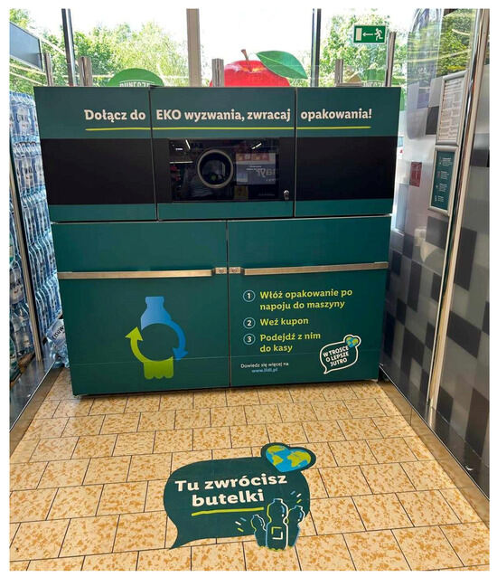 The first machines for packaging and packaging waste appeared on the Polish market in Krakow on 17 April 2019. The machine worth PLN 20,000 was then loaned to the Krakow City Hall for two weeks by Grand Technology. Currently, due to the short period of entry into force of the Act, the Kaufland, Żabka, Lidl, Biedronka, Spar, Carrefour and PSH Lewiatan store chains are taking the initiative to install bottle vending machines themselves [32,34,35]. Figure 3 shows a packaging return machine in a Lidl store.