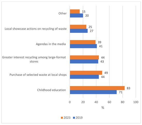 In Zarębska’s book titled Management of Packaging Waste in the Context of a Circular Economy—Essence, Tools, Environmental Communication [7] (p. 265), published in Poland in 2019, the author publishes research conducted on a group of 1067 people from all over the country, which indicates that consumers see a great need to improve the current municipal waste management system, especially packaging waste. For comparison, the present authors supply the results of the research that has not been published yet. The data is from the end of 2023. The results presented in Figure 4 indicate that 71% of respondents consider the need to educate the youngest to be a priority factor in improving the waste management system and management (2023—83%). The purchase of selected waste at local shops (supermarkets) and smaller local stores—44% (2023—49%), greater interest recycling among large-format stores—43% (2023—44%), information programs in the media—40% (2023—39%), demonstration campaigns for the public on the correct segregation of waste—27% (2023—25%).
